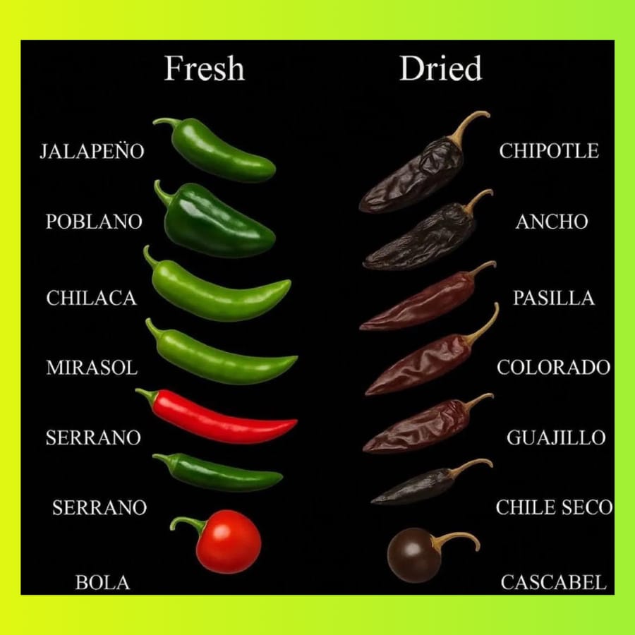 Diese Grafik schafft genau das. In einem einzigen Quadrat zeigt sie, wie sich Paprika komplett verändern, sobald sie getrocknet werden. Jalapeño wird zu Chipotle, Poblano wird zu Ancho, Mirasol wird zu Guajillo.